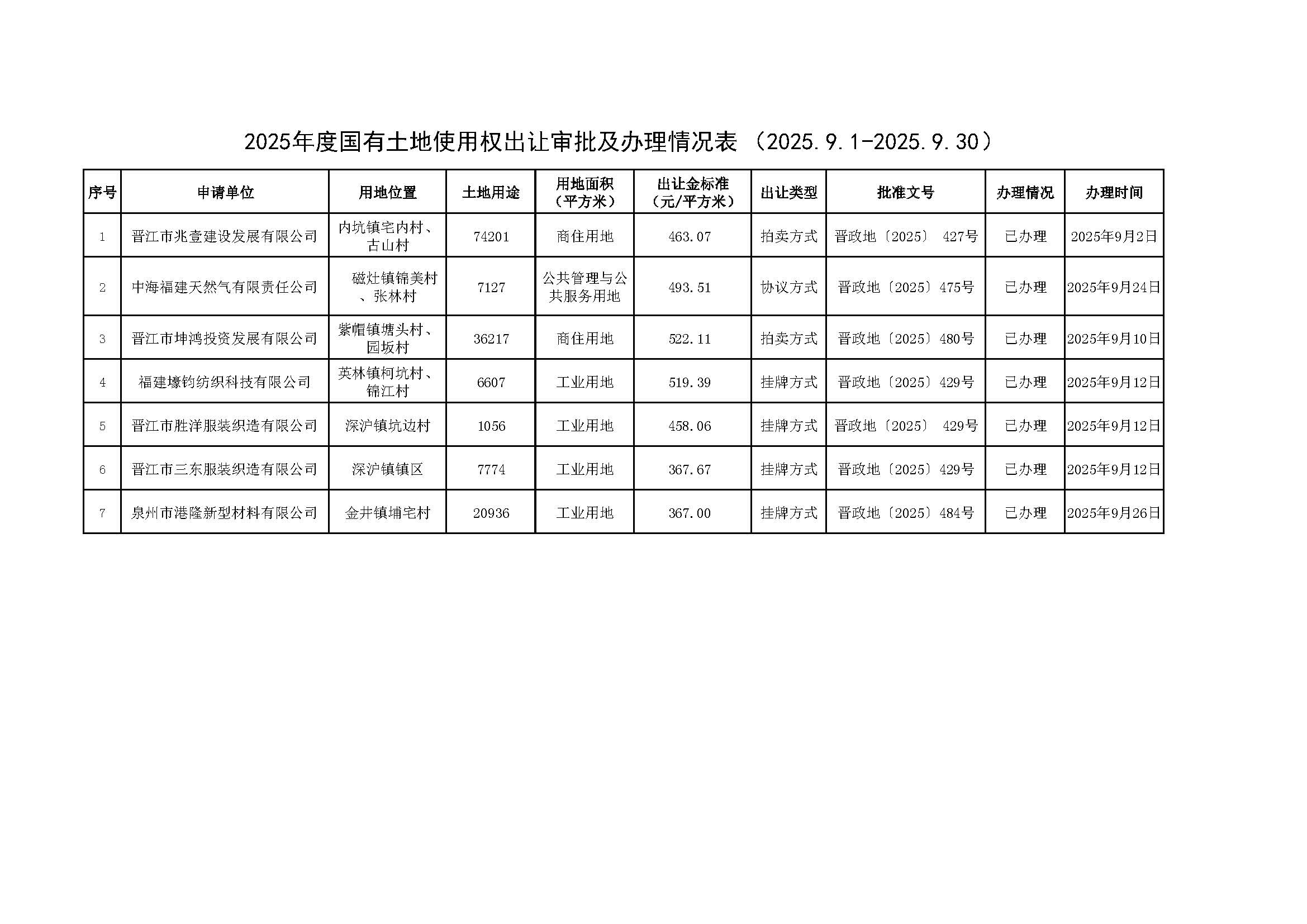 2025年度國有土地使用權(quán)出讓審批及辦理情況表(2025.9.1-2025.9.30)