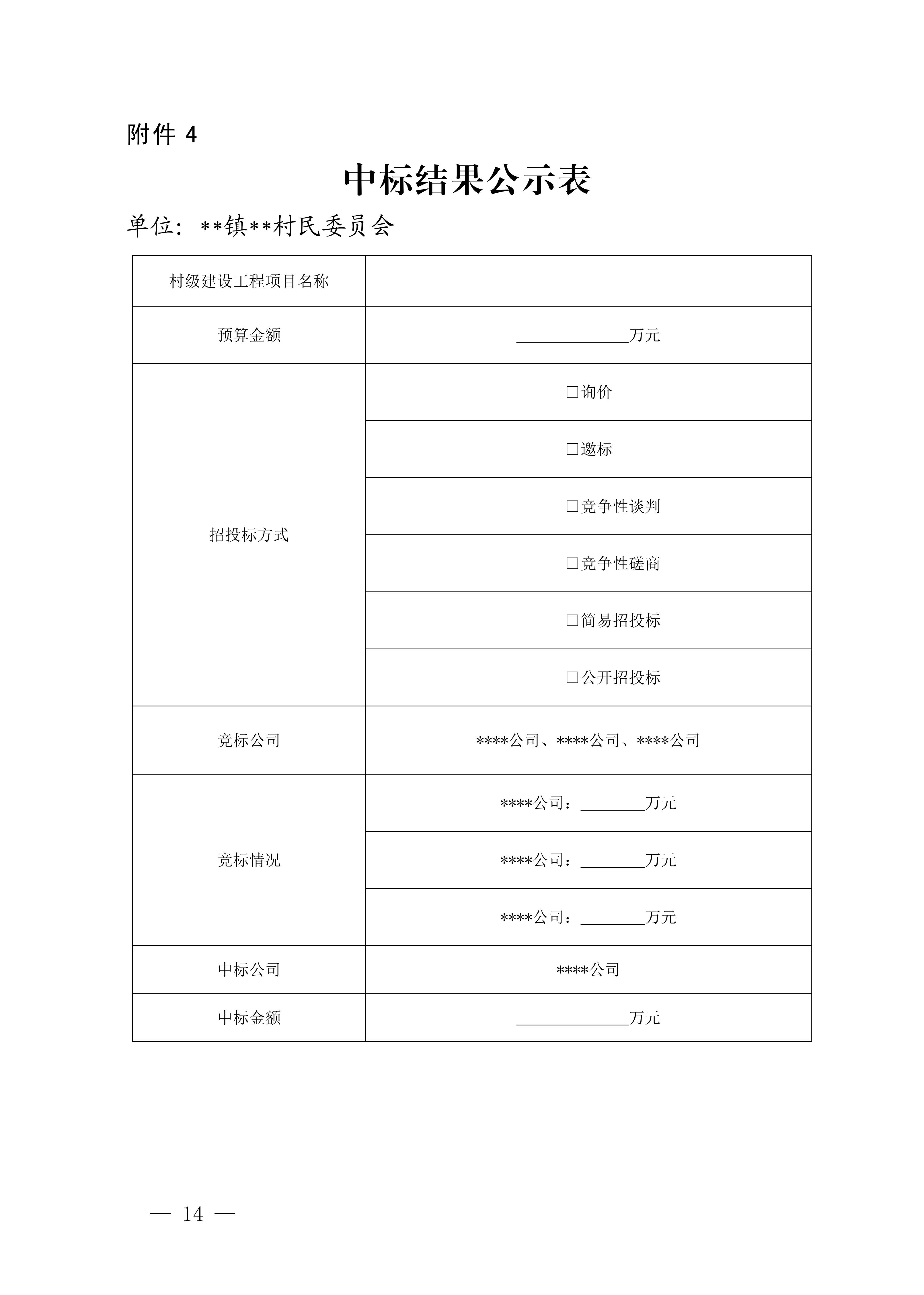 3.實施結(jié)果公開。在福建省基層小微權(quán)力監(jiān)督平臺、村務(wù)公開欄公開公示。公示內(nèi)容:施工(承建)合同、《村級建設(shè)工程項目竣工驗收報告單》(附件5)、竣工結(jié)算書、工程是否增補證明等,時間不少于3日。